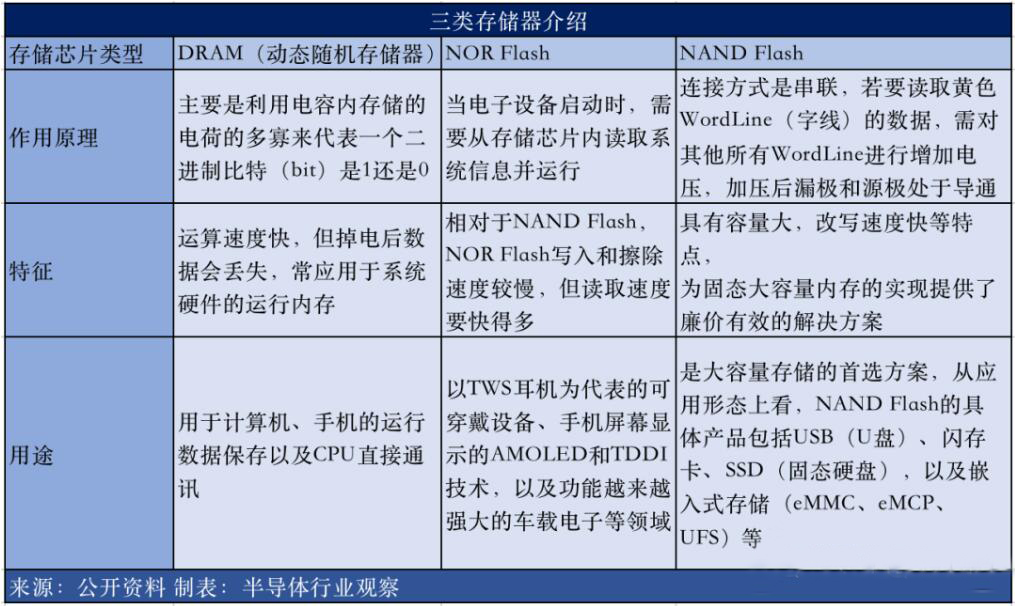 从市场规模来看,当下最主流的存储器是DRAM,Nand Flash和NOR Flash,这三者占据了所有半导体存储器规模的95%左右,尤其是前两者,占总量