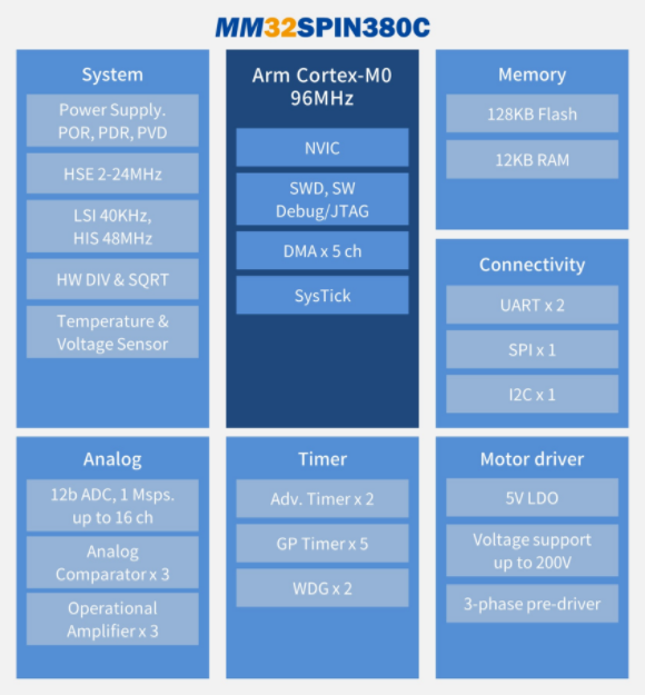 灵动微MM32SPIN380C使用高性能M0为内核的32位单片机,工作频率最高可达96兆赫兹,内置128KBFlash和12KBRAM的高速存储器,丰富的I O端口和多