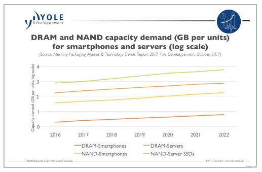 存储器行业正处于飞速增长的阶段。Yole在其《2017年存储器封装市场与技术》报告中预计,2016~2022年整个存储器市场的复合年增长率约为9%,到2022将达到1350亿美元,DRAM和NAND市场份额共计占约95%