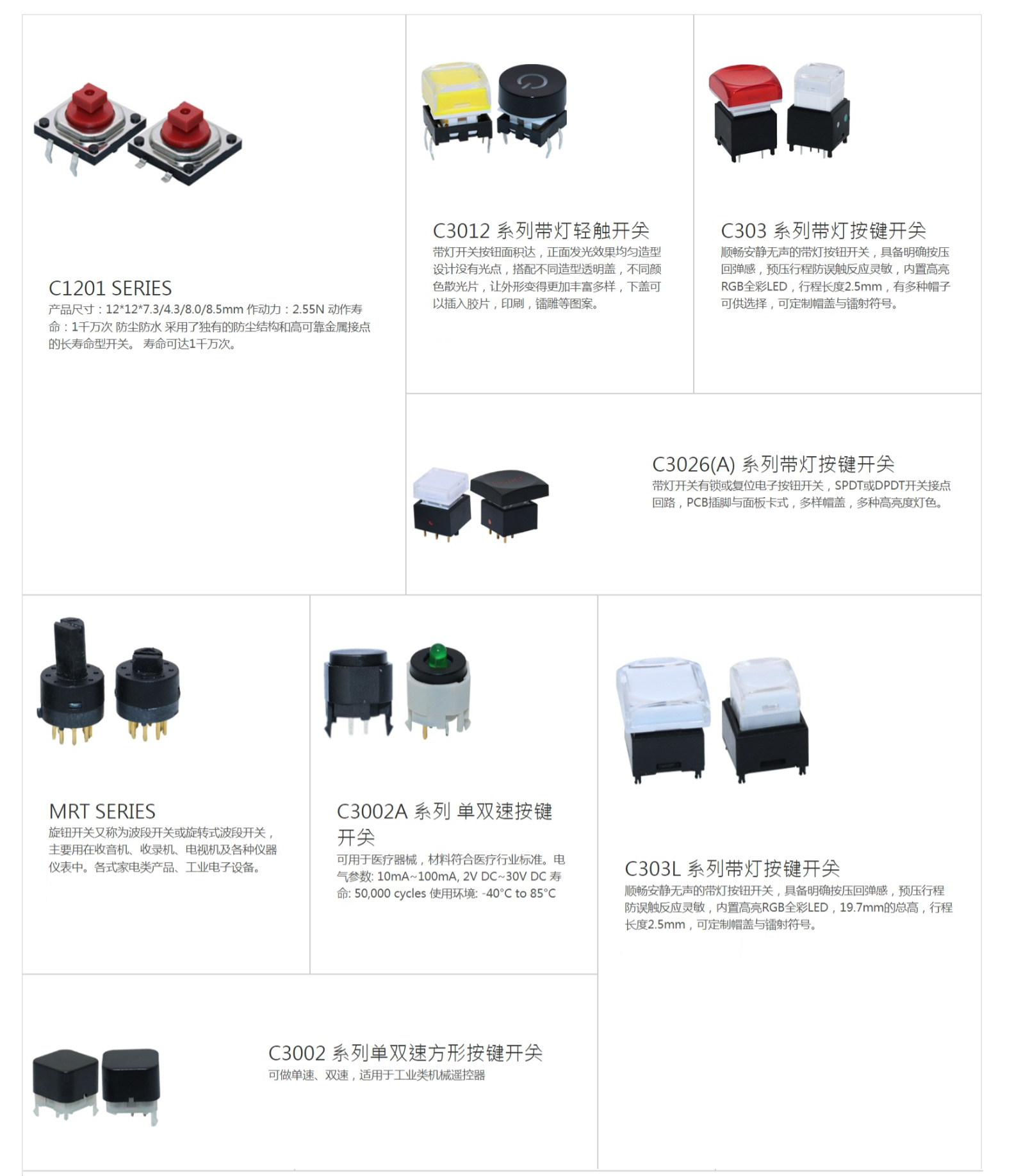 昭华专业生产电子开关,轻触开关,带灯开关,LED发光开关等电子开关产品,拥有进口精密的生产设备和精湛的生产技术。昭华引进专业人才及研发团队,从产品设计到制造模具开发制造的持续垂直整合,客户涉及医疗行业,工业控制和自动化行业,汽车电子行业,电子电源行业,家电行业,3C行业领域。