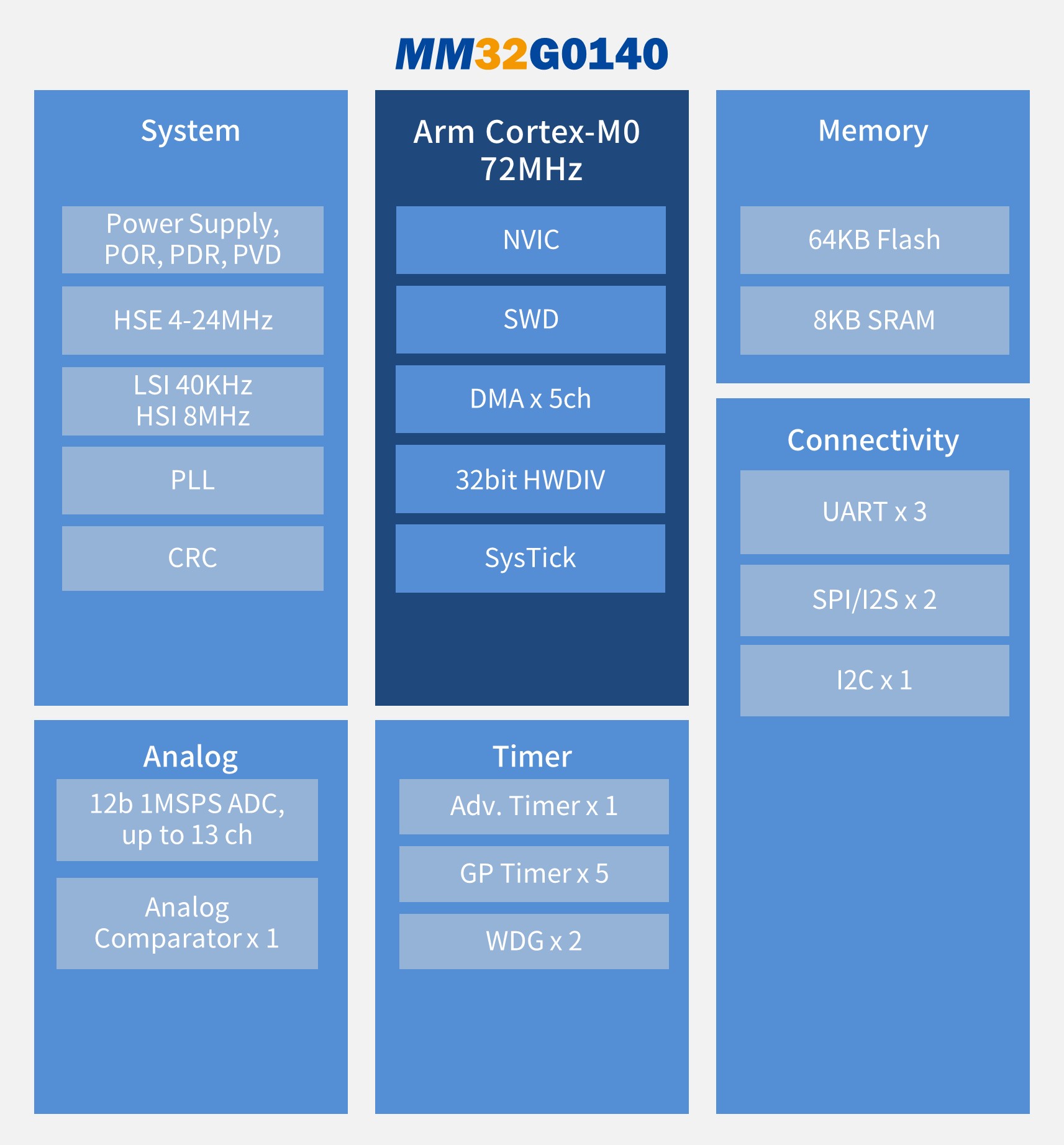 MM32G0140使用高性能的Arm®Cortex-M0为内核的32位微控制器,工作频率可达72MHz,内置64KB Flash,8KB SRAM高速存储器,丰富的增强型I/O端口和多种外设。1个12位ADC、1个模拟比较器、1个16位高级定时器、1个32位通用定时器、1个16位通用定时器、3个16位基本定时器、3个UART接口、2个SPI接口和1个I2C接口、工作电压为2.0V-5.5V、工作温度范围(环境温度)-40℃-105℃扩展工业级(后缀为V)、提供LQFP32、QFN32、QFN28和TSSOP20封装。适合于多种应用场合:工业控制、数字电源、新能源光伏、电机控制、智能家居。