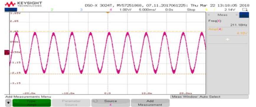 图2. 电流命令2A下的V相电流波形, 实际量测结果为±2.05A (电流探棒规格1A/1V)