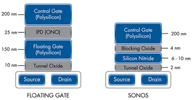 Nv SRAM的非易失性单元基于SONOS技术。他们利用Fowler-Nordheim隧穿(FN隧穿)的优势通过将电荷捕获在夹层氮化物层中来存储数据。FN隧道技术的主要优势在于,它可以大大提高NV耐久性,并大大降低磨损。SONOS技术的另一个优点是易于集成到CMOS中(仅两个附加的掩模)。这使得NV单元可以在每个存储位中紧邻6T SRAM单元放置,从而使SRAM到NV的传输全部并行进行,并且功耗非常低。