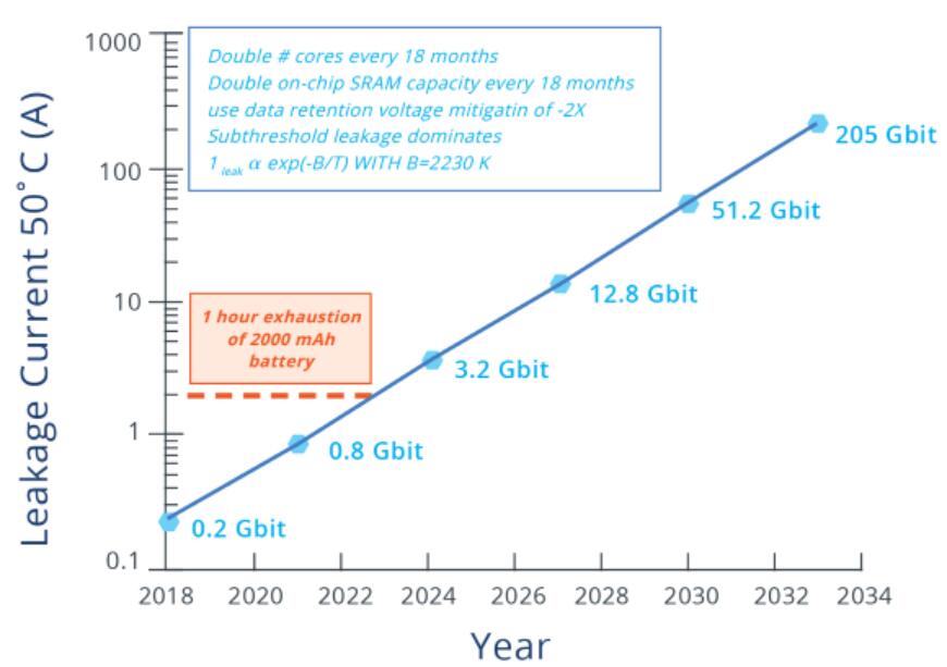 第二项挑战在于从正电源流经SRAM单元到接地的漏电流。其中很大一部份原因是次阈值晶体管泄漏的指数级温度启动——这意味着随芯片变热,这种漏电流将会急剧增加,这导致了能量的浪费。虽然这通常称为静态功耗,但这种漏电流也会在SRAM处于有效使用状态时发生,并形成能量浪费的下限。