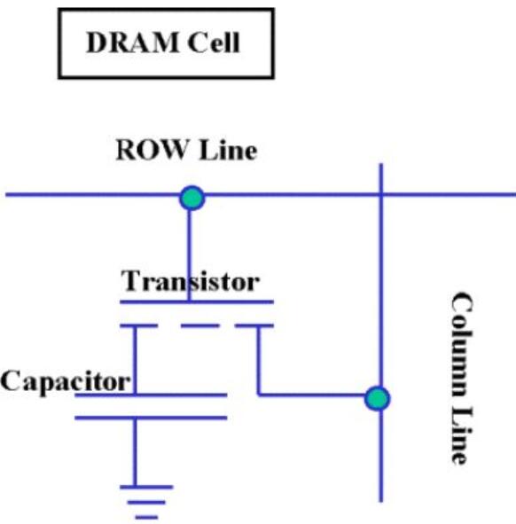 DRAM cell结构由1个MOS和1个电容组成,由电容是否带电荷来区分0和1。不过,由于电容漏电流的原因,DRAM无法长时间保存数据,需要“动态”刷新(刷新周期在亚ms级别)。