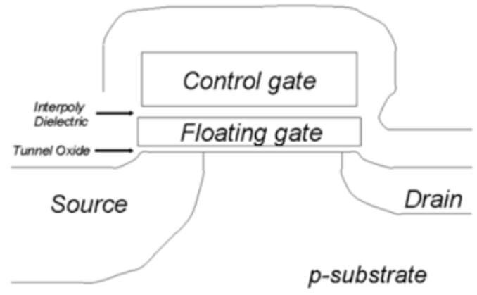 不管是Nor-flash还是Nand Flash,单位cell的结构都类似如下,为双gate的MOS结构。中间一层floating gate无漏电存在,可以保存住电荷而实现非易失。