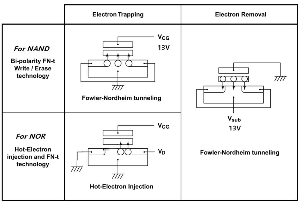 Floating gate上电荷转移需要外加电压实现。在Control gate和沟道之间施加的反向电压可以去除电荷,也即擦除erase操作。在Control gate和沟道或source 之间施加正向电压可以将电荷转移到floating gate上。