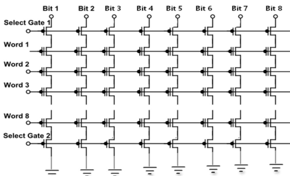 通过NOR FLASH的结构原理图,可见每个Bit Line下的基本存储单元是并联的,当某个Word Line被选中后,就可以实现对该Word的读取,也就是可以实现位读取(即Random Access),且具有较高的读取速率。