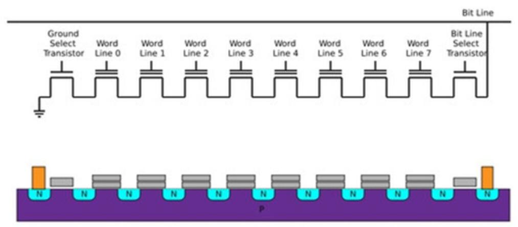 基本存储单元的串联结构减少了金属导线占用的面积,Die的利用率很高,因此NAND FLASH存储密度高,单bit成本低。适用于需要大容量存储的应用场合,即适用于data-storage。