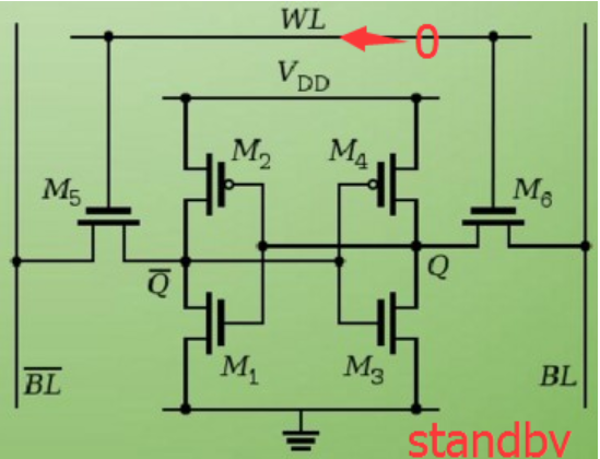 假如WL沒有选为上拉电阻,那么M5和M62个做为操纵用的晶体三极管处在短路情况,也就是基础模块与基准线BL防护。而M1-M4构成的2个反相器持续保持其情况。