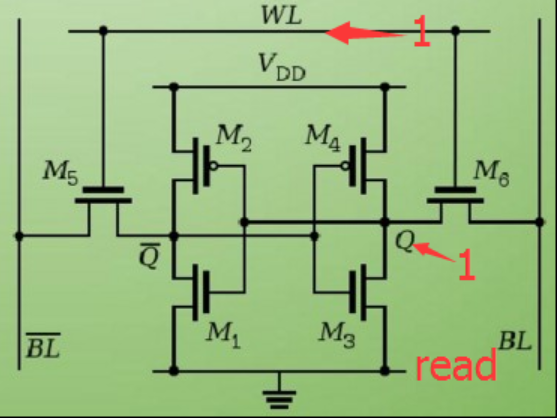 最先,假定储存的內容为1,也就是Q处为上拉电阻。读周期时间原始,二根基准线BL,BL#预在线充值为上拉电阻,由于读写能力情况时,WL也会为上拉电阻,促使让做为自动开关的2个晶体三极管M5,M6通断。