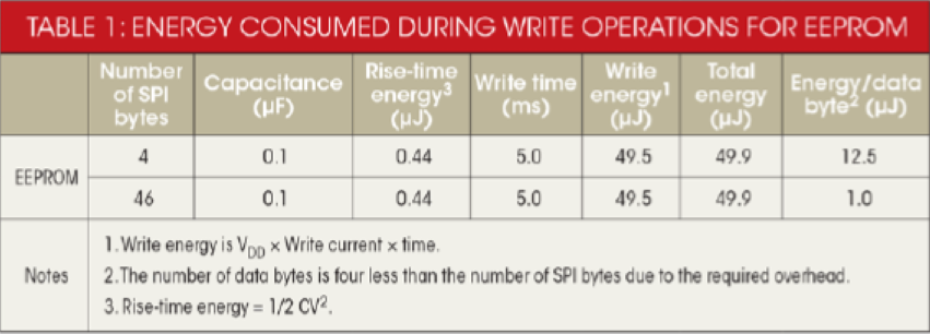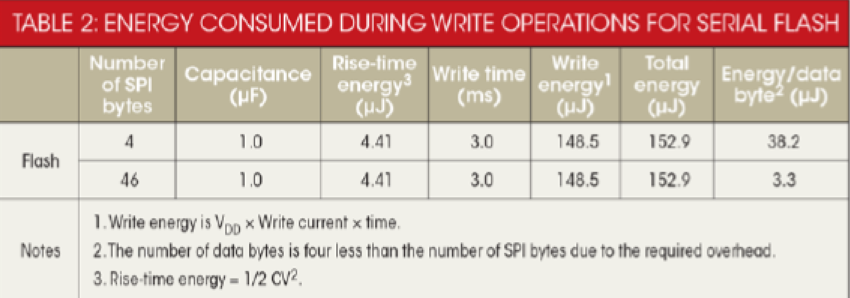 内存Flash具有更高的写入和待机电流,因此我们将使用50μA的待机电流(写入时间)在我们的评估中为3 ms,写入电流为15 mA(表2)。如上所述,我们假设通电时间为零,数据适合一页,并且写入时间很长,我们可以忽略通信时间。另外,我们假设闪存写入到已擦除的页面。