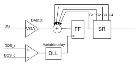 据内部可靠消息,由于DDR5的数据速率已经达到甚至超过了现在一些串行总线的数据速率,所以DDR5芯片的接收端还会采用在串行总线上广泛应用的可变增益放大器VGA(variable gain amplifier)、可变Delay(通过DLL实现)以及4阶DFE(decision feedback equalizer)均衡技术以优化采样位置和眼图的质量。下图是DDR5芯片接收端的设计架构。