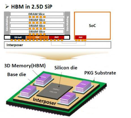 HBM技术可以把最多8层DRAM的Die堆叠起来,并通过TSV(Through-Silicon Vias:硅通孔)技术和内存控制器通过相应的Interposer互联起来。在HBM接口中,内存控制器和和不同的Die间采用独立的Channel进行互联,各个Channel间互相没有关系,因为可以进行独立的时序设计以提高数据传输速率。比如在采用4层Die堆叠、每个Die有2个Channel、每个Channel有128bit宽度时,如果采用4颗芯片,则总的数据位宽= 4(Stack)*4(Die)*2(Ch)*128(bit)= 4096bit。
