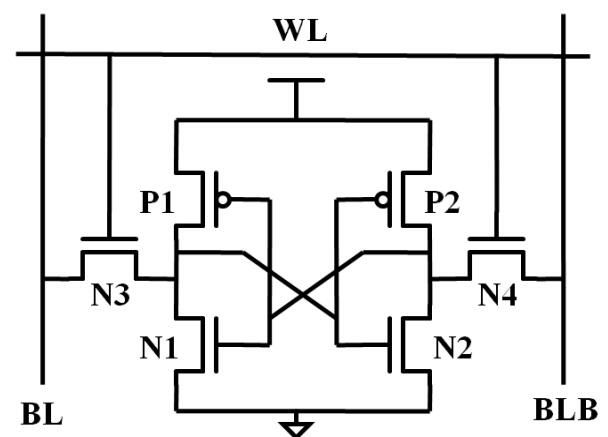 根据图1中反相器的不同,单端口SRAM单元有电阻负载型、无负载型和六管 CMOS 单元等。电阻负载型存储单元由于电其压传输特性曲线(VTC)不陡并且功耗大已远离了主流设计;无负载型存储单元虽然可以实现较高的密度[16],但其稳定性差;六管 CMOS SRAM 单元是目前主流的设计,其结构如图2 所示。它由 6 个晶体管(N1~N4、P1~P2)组成,N1、N2 叫做下拉(PD)管,P1、P2 叫做上拉(PU)管,N3、N4 是存取管,有时也叫传输管(PG)。这种六管存储单元具有很好的健壮性、低功耗和低电压工作特性,所以非常受欢迎;下文中的两端口和双端口存储单元以及在分析SRAM 单元的操作、特性时都将采用这种结构,并简称为六管单元。