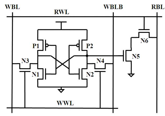 随着工艺尺寸的不断降低,参数波动变得越来越严重,六管SRAM存储单元固有的缺点(见下文)导致其在低电压情况下难以提供足够的稳定性,于是出现了一种 8 管 SRAM 单元[17],如图 3 所示。这种结构具有独立的读写字线(RWL, WWL)和读写位线(RBL, WBL 和 WBLB),从而有分开的读端口和写端口;数据从读端口读出,从写端口写入。这样不仅提高了稳定性,而且可以进行同时读写,从而有更高的性能。但是由于读端口是单端的,外围放大电路需要更大的读位线摆幅(较之差分)才能得到满幅的逻辑电平,所以导致存取时间变长。
