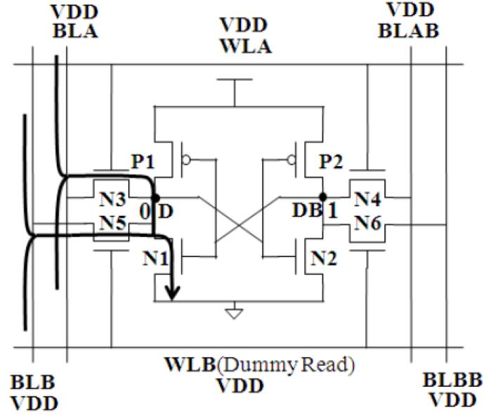 图3是图2(b)中左边进行读操作的存储单元的具体情形,可以看到,B端口的写操作使WLB为高电平,此高电平对该单元产生了伪读取操作。与单端口SRAM的读取操作相比,下拉管N1将同时对BLA和BLB放电,这将导致两个结果:第一,对BLA的放电电流减小,造成读取时间增加;第二,D点电压将会比