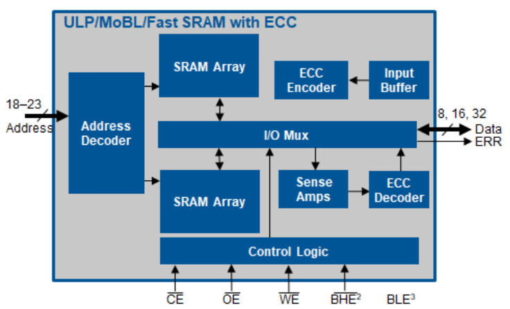 赛普拉斯最新一代的异步SRAM器件使用(38,32)汉明码ECC进行单位错误检测和纠正。赛普拉斯超可靠异步SRAM中的硬件ECC模块可在线执行所有与ECC相关的功能,而无需用户干预。