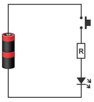 让我们用一个点亮LED的电路为例,来说明。如下图所示,不使用MCU的电路是一个由LED,开关和电阻构成的简单电路。