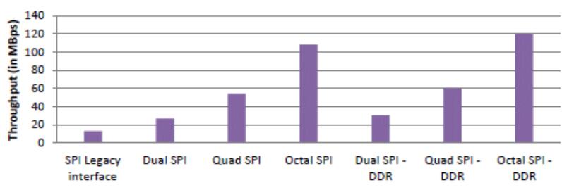 通过改进的SPI设备中还引入了双重数据速率协议,这进一步推动了吞吐量的界限。图1显示了SDR工作频率为108 MHz,DDR频率为133 MHz的各种SPI设备的吞吐量。新的SPI器件即将面市,它在SDR中提供高达133 MHz的频率支持,在DDR模式下提供80 MHz的支持,分别导致133MBps和160MBps的吞吐量。这些创新已大大缩小了并行和NOR闪存设备之间的差距,为高吞吐量要求的系统提供了一种低成本解决方案。